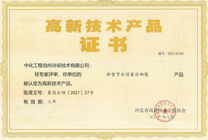 High tech products are brand-new products in the national and provincial high-tech key scope, technical field and product reference catalogue. They have high technical content, good economic benefits and broad market prospects, and can improve the market competitiveness of products. The identification of high-tech products directly proves the high-tech content of products and increases the trust of customers. In order to win this honor, the company identified four major products: high efficiency and energy-saving industrial cooling tower, new water-saving mist elimination cooling tower, high efficiency and energy-saving industrial circulating water system and new high efficiency and energy-saving air cooler in June 2021.